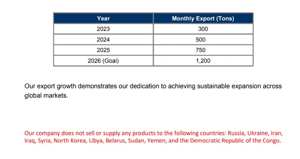 Vision: To build long-term partnerships with suppliers and customers worldwide, providing transparent and sustainable trading solutions while expanding our export capacity to 1,200 tons per month by 2026.